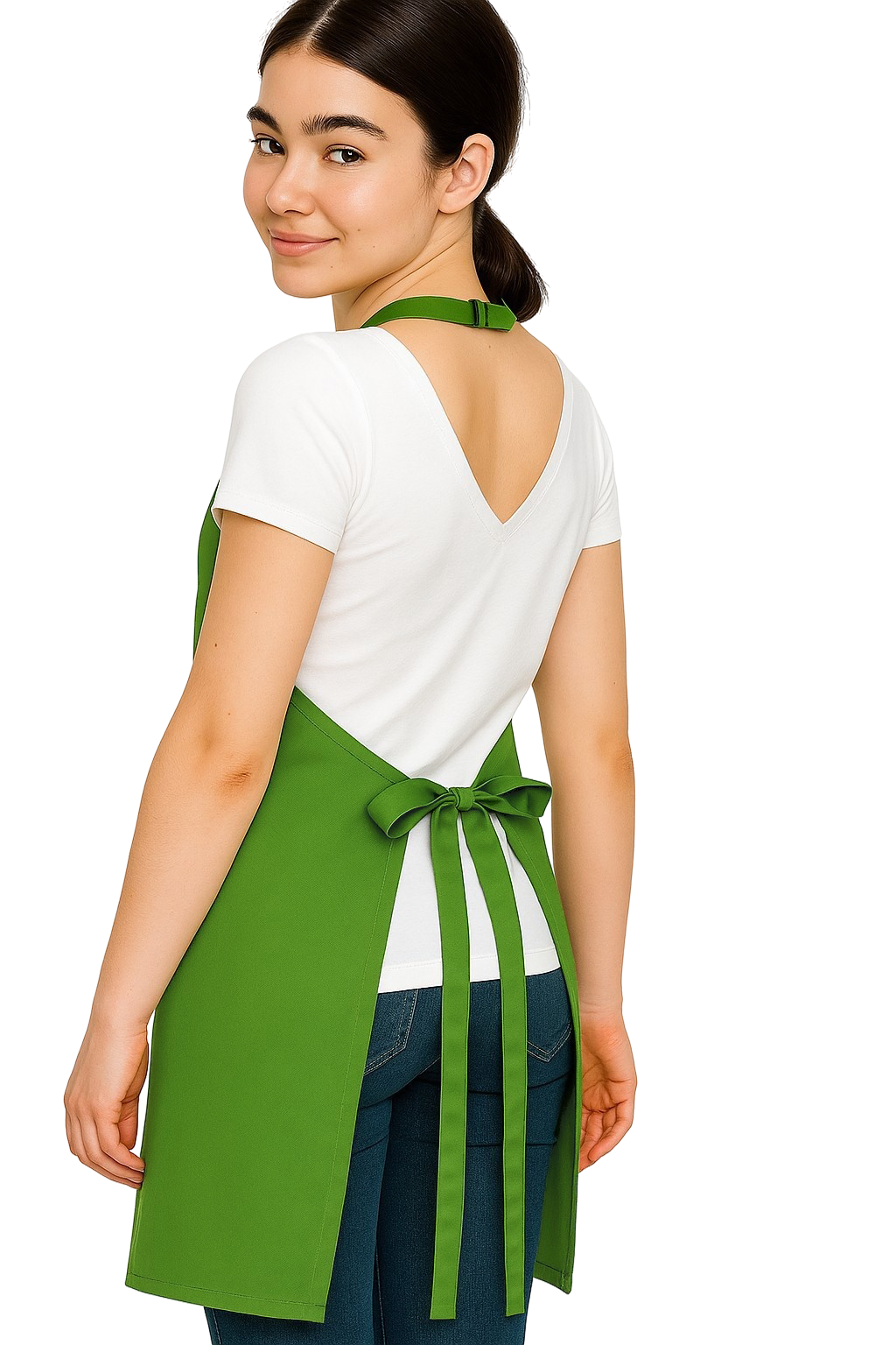Wiązany z tyłu taśmą bawełnianą o szer. 3 cm i długości 50cm, na górze wkładany przez głowę z klamerką regulującą