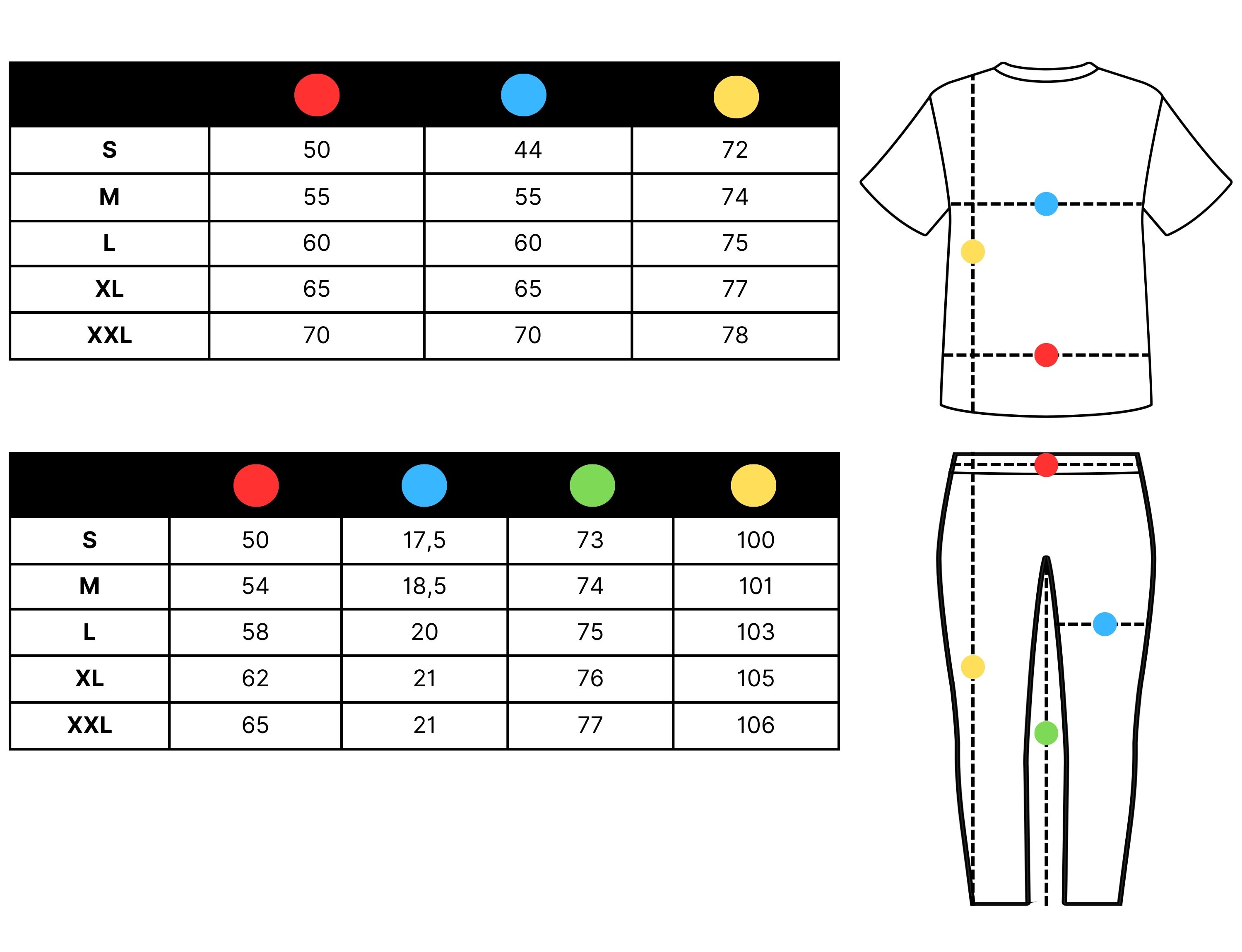 Komplet wykonany jest z mocnej i wysokiej jakości tkaniny  67% poliester, 27% wiskoza, 6% spandex , zapewniającej trwałość, wygodę i komfort noszenia, charakteryzującej się żywymi kolorami po wielokrotnym praniu.