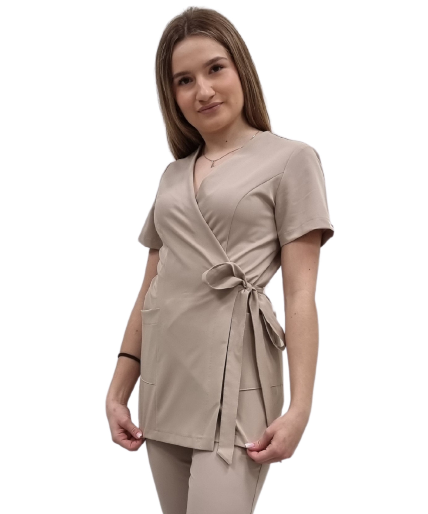 Nasz żakiet kopertowy, tunika  to idealny wybór dla profesjonalistek branży medycznej, kosmetycznej oraz  innych sektorów. Wykonany z wysokiej jakości elastycznej tkaniny 200g/m2,rozciągliwej w 4 kierunkach, z dodatkiem wiskozy, zapewnia komfort noszenia i swobodę ruchu. .Kopertowy krój podkreśla sylwetkę, a szeroki pasek wiązany w talii umożliwia precyzyjne dopasowanie do każdej  figury. Praktyczne głębokie 2 kieszenie na wysokości bioder,umożliwią przechowywanie niezbędnych akcesoriów . Tunika idealnie sprawdzi się w dni które wymagają dużej aktywności fizycznej. Elegancki design, różnorodność kolorystyczna oraz funkcjonalność, sprawią że wyróżnisz się w tłumie.