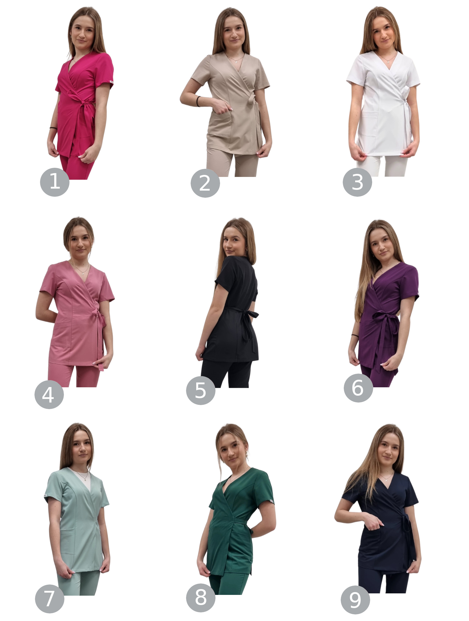 Nasz żakiet kopertowy, tunika  to idealny wybór dla profesjonalistek branży medycznej, kosmetycznej oraz  innych sektorów. Wykonany z wysokiej jakości elastycznej tkaniny 200g/m2,rozciągliwej w 4 kierunkach, z dodatkiem wiskozy, zapewnia komfort noszenia i swobodę ruchu. .Kopertowy krój podkreśla sylwetkę, a szeroki pasek wiązany w talii umożliwia precyzyjne dopasowanie do każdej  figury. Praktyczne głębokie 2 kieszenie na wysokości bioder,umożliwią przechowywanie niezbędnych akcesoriów . Tunika idealnie sprawdzi się w dni które wymagają dużej aktywności fizycznej. Elegancki design, różnorodność kolorystyczna oraz funkcjonalność, sprawią że wyróżnisz się w tłumie.